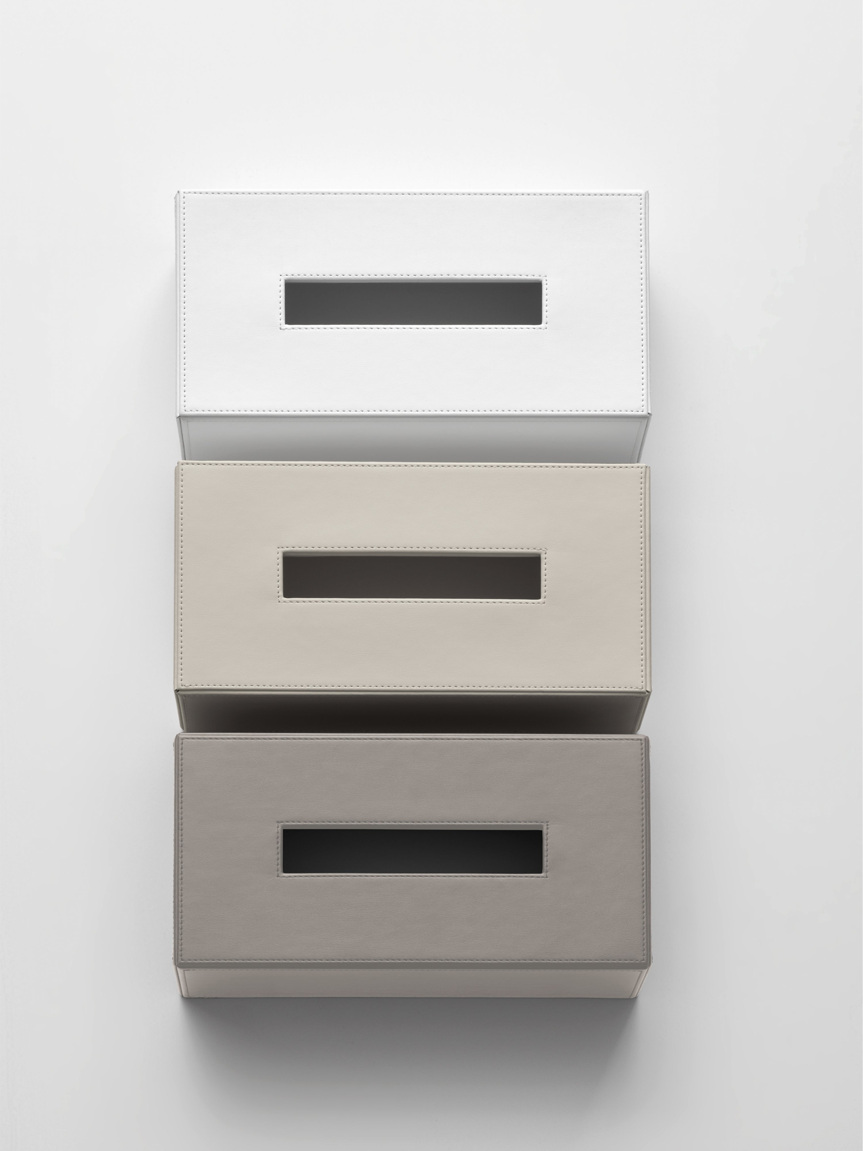 With its elegant look, the collection serves as both a stylish accessory and a modular storage solution. The surface features faux leather with a tone-on-tone stitching effect. BROWNIE is available in the chic, soft colors taupe and sand, as well as the classic black and white.
