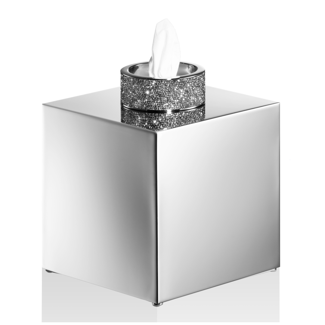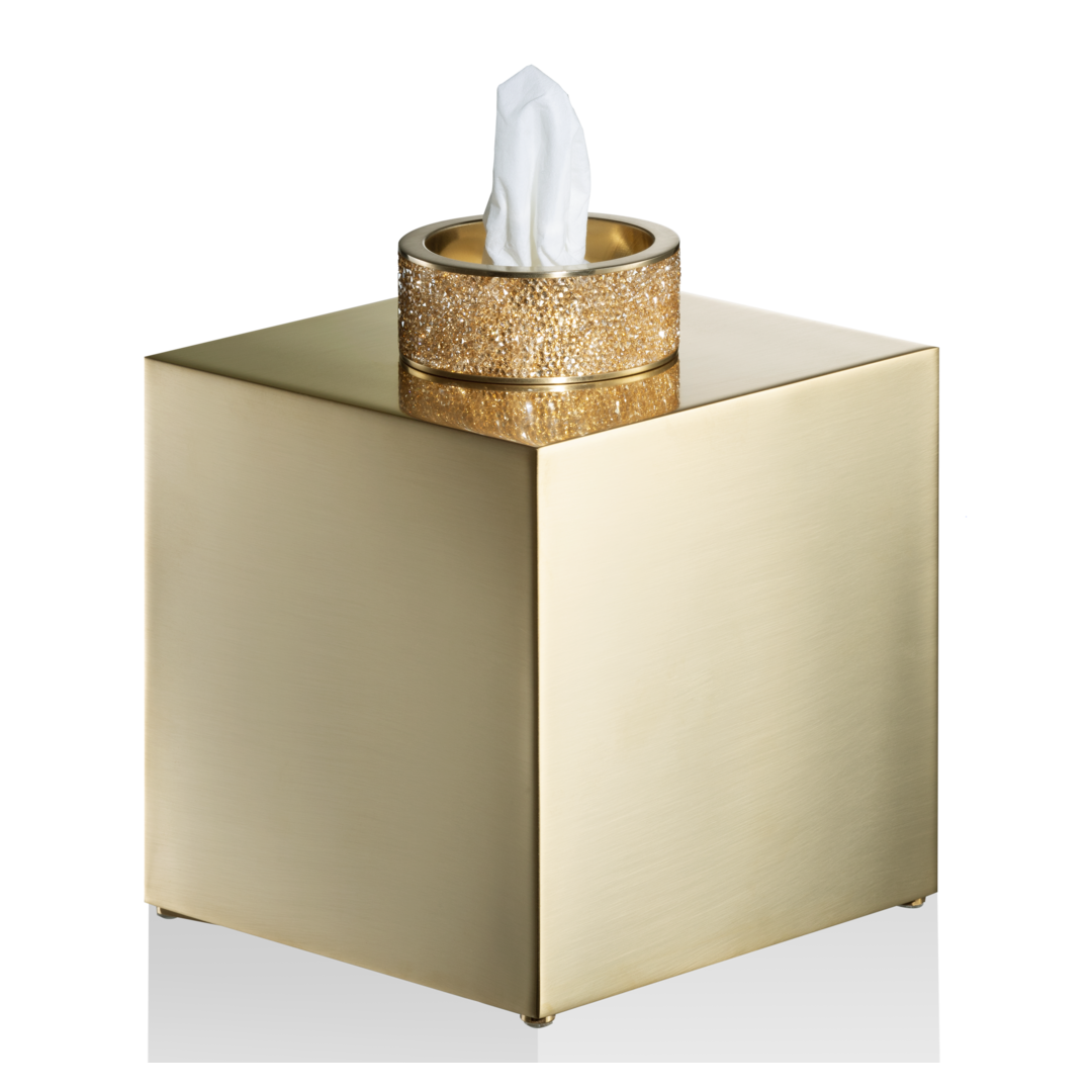 Die ROCKS Papiertuchbox ist anders als alle anderen. Die quadratische Kleenexbox aus hochwertigem Messing ist mit einem brillanten Ring aus Swarovski-Kristallen verziert, der zugleich als Öffnung dient. Die farbbrillanten Kristalle sorgen für einen irisierenden Glanzeffekt, der sich je nach Lichteinfall verändert. Die Symbiose aus Materialität und Emotionalität ist Anmut und Zauber zugleich und strahlt eine erhabene Eleganz aus.